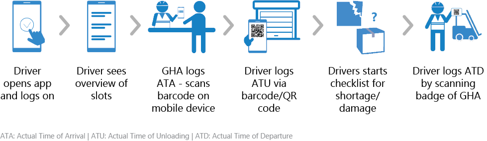 With the mobile Acceptance & Delivery app for forwarders, drivers have direct access to all info regarding the booked slots that are assigned to them. Throughout the pick up or delivery process, they can register all related information in real-time on their mobile device. This enables them to save time, reduce administration, eliminate fraud-sensitive handover of paper documents and improve process visibility.