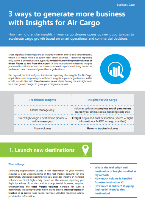 Having granular insights in your cargo streams opens up new opportunities to accelerate cargo growth based on smart operational and commercial decisions. This report zooms in on 3 ways to generate more business with Insights for Air Cargo.